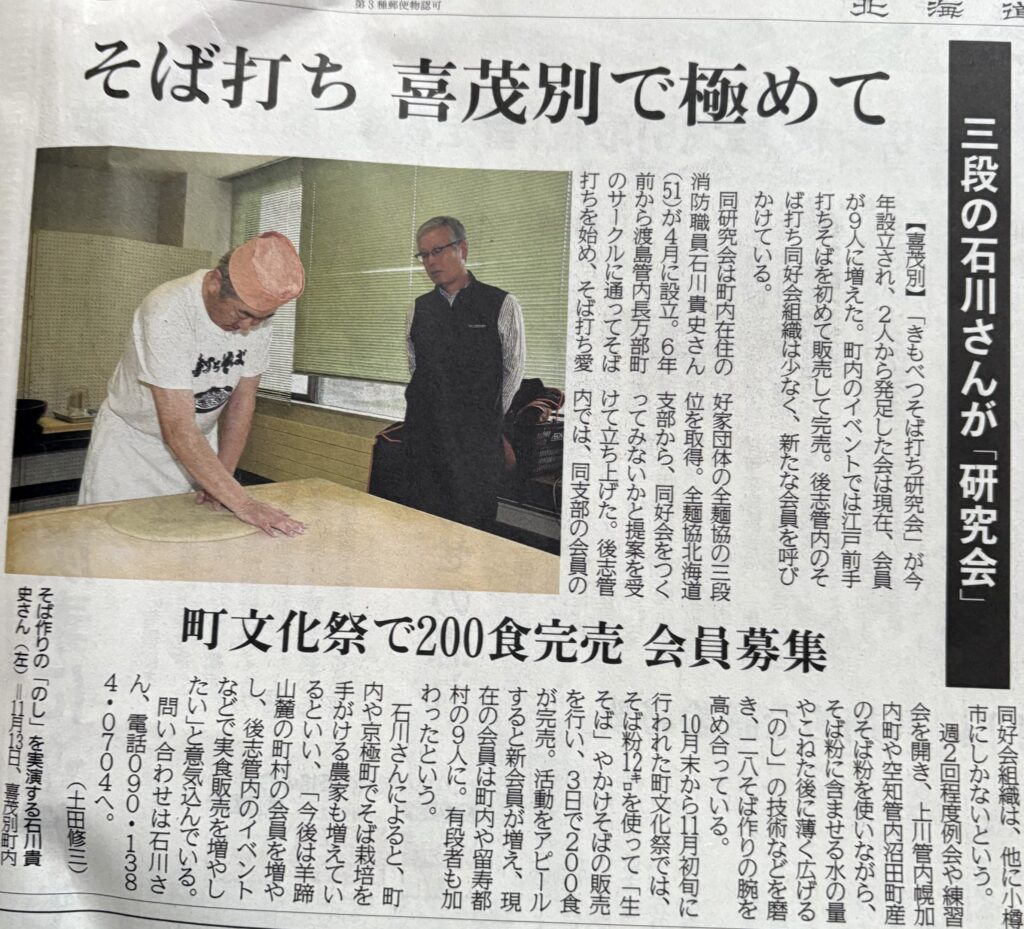 きもべつそば打ち研究会の活動状況が、2025年11月13日付の北海道新聞に掲載されました。